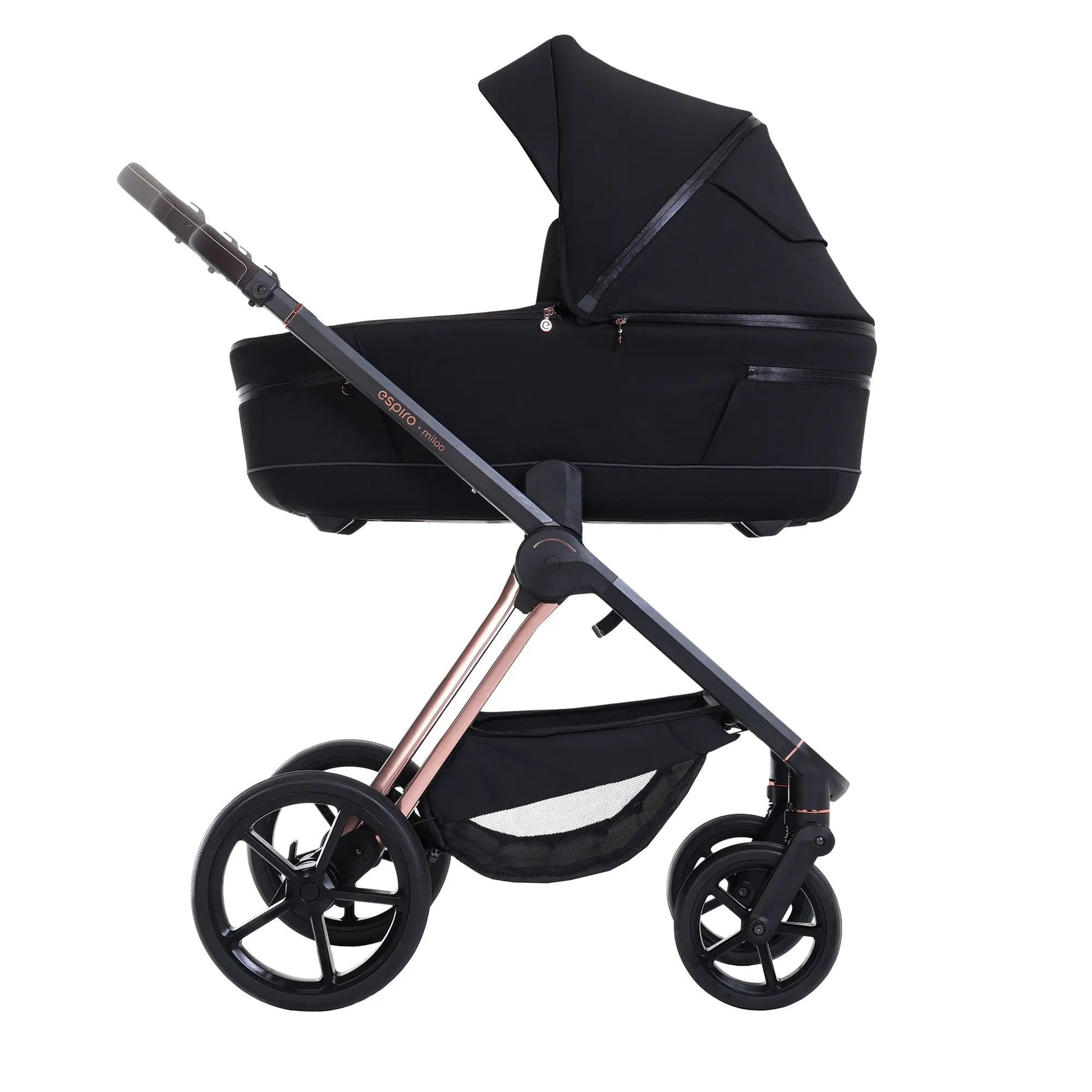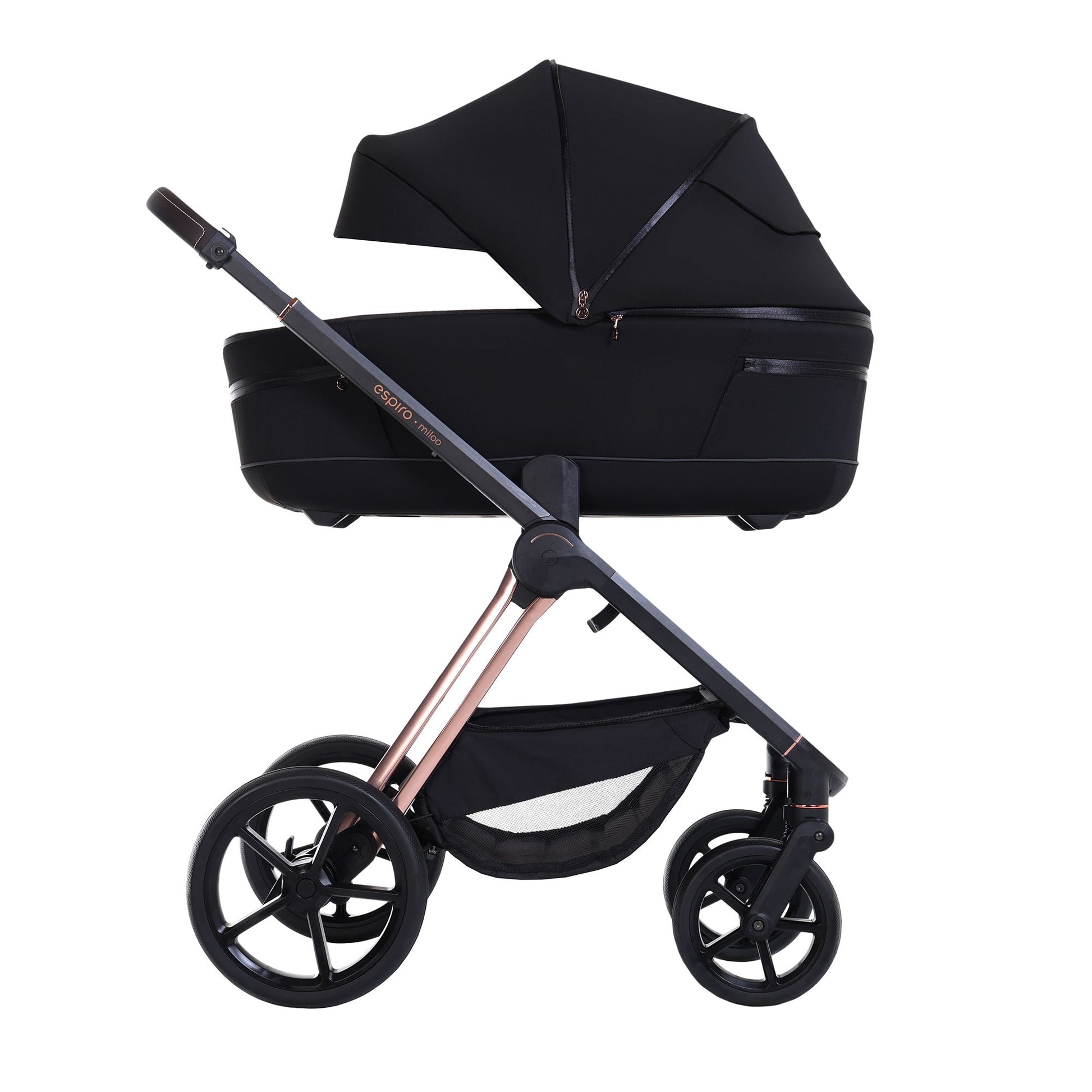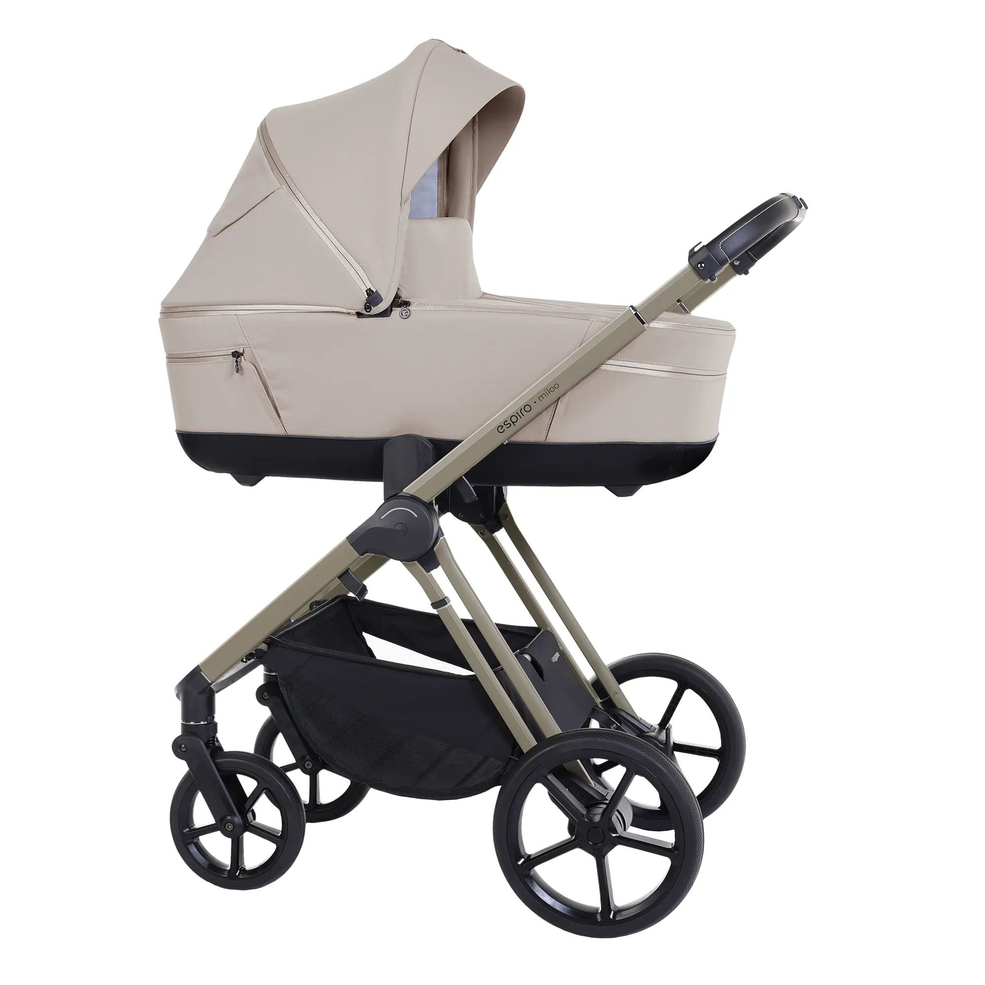 espiro miloo is a stroller with a frame on which you can attach a bassinet for your newborn, and later, a seat for an older child. With special adapters, you can also connect it to a car seat. The stroller also features adapters that allow you to elevate the bassinet for added convenience.