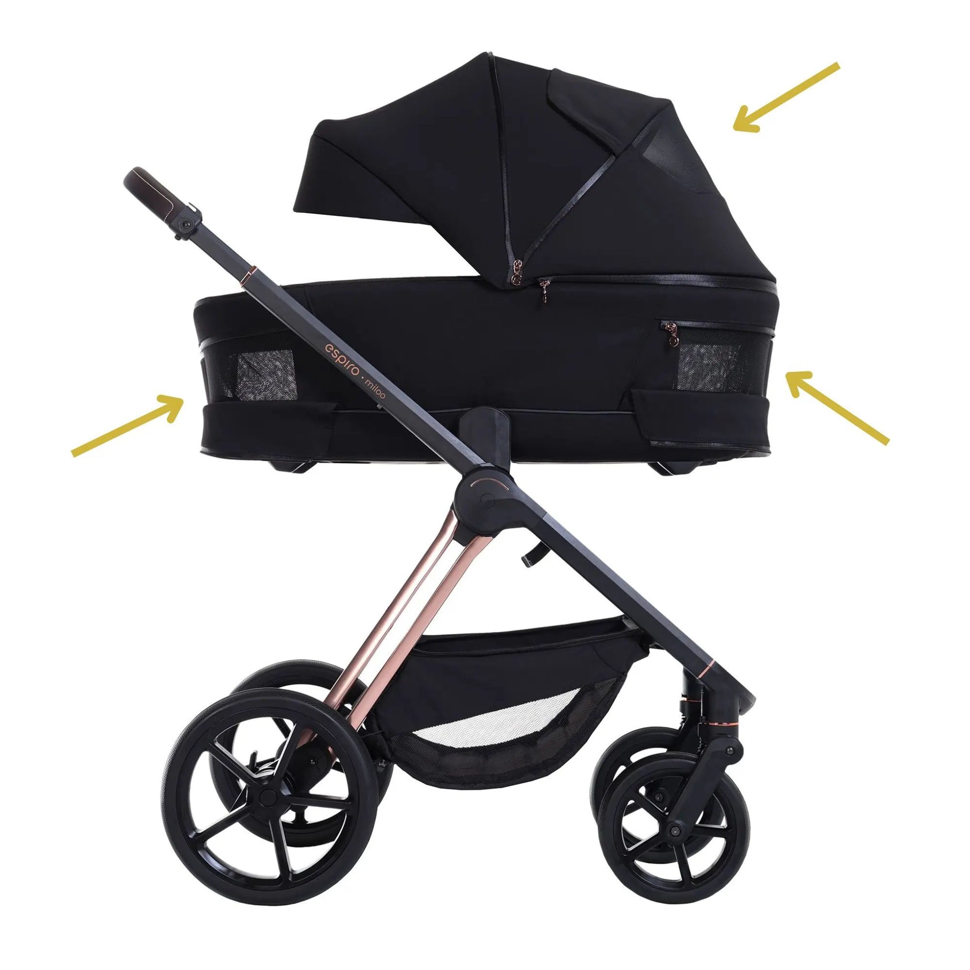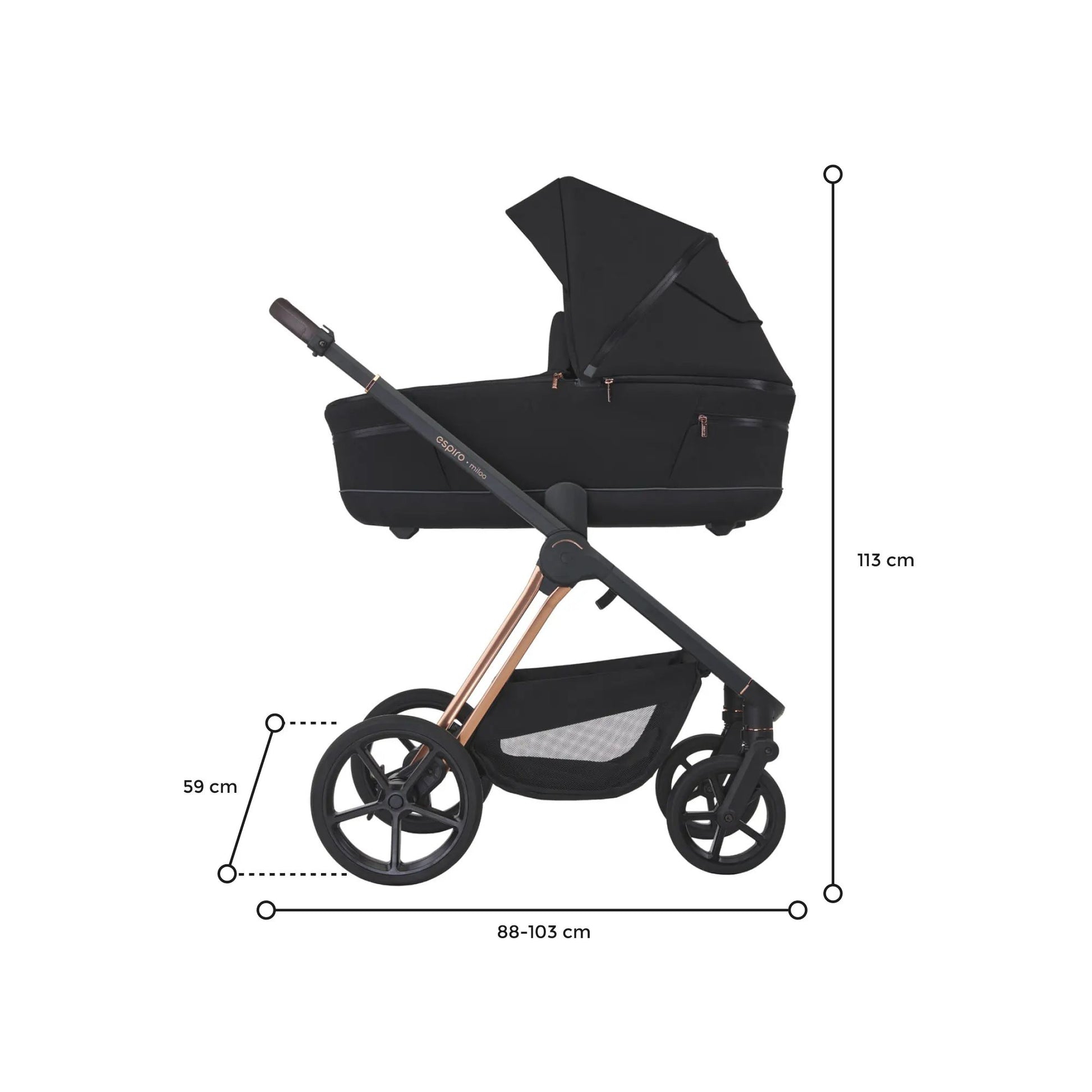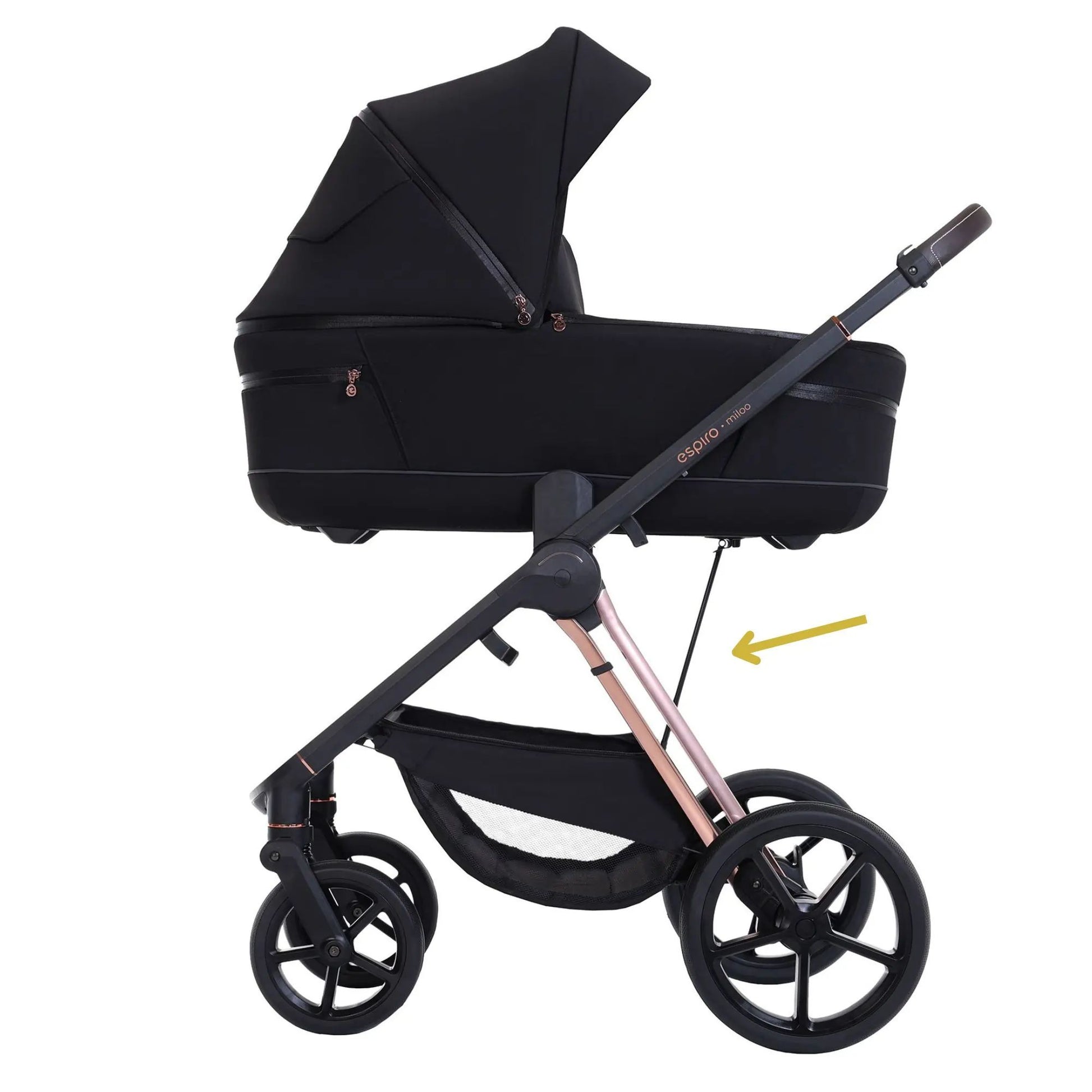 espiro miloo is a stroller with a frame on which you can attach a bassinet for your newborn, and later, a seat for an older child. With special adapters, you can also connect it to a car seat. The stroller also features adapters that allow you to elevate the bassinet for added convenience.