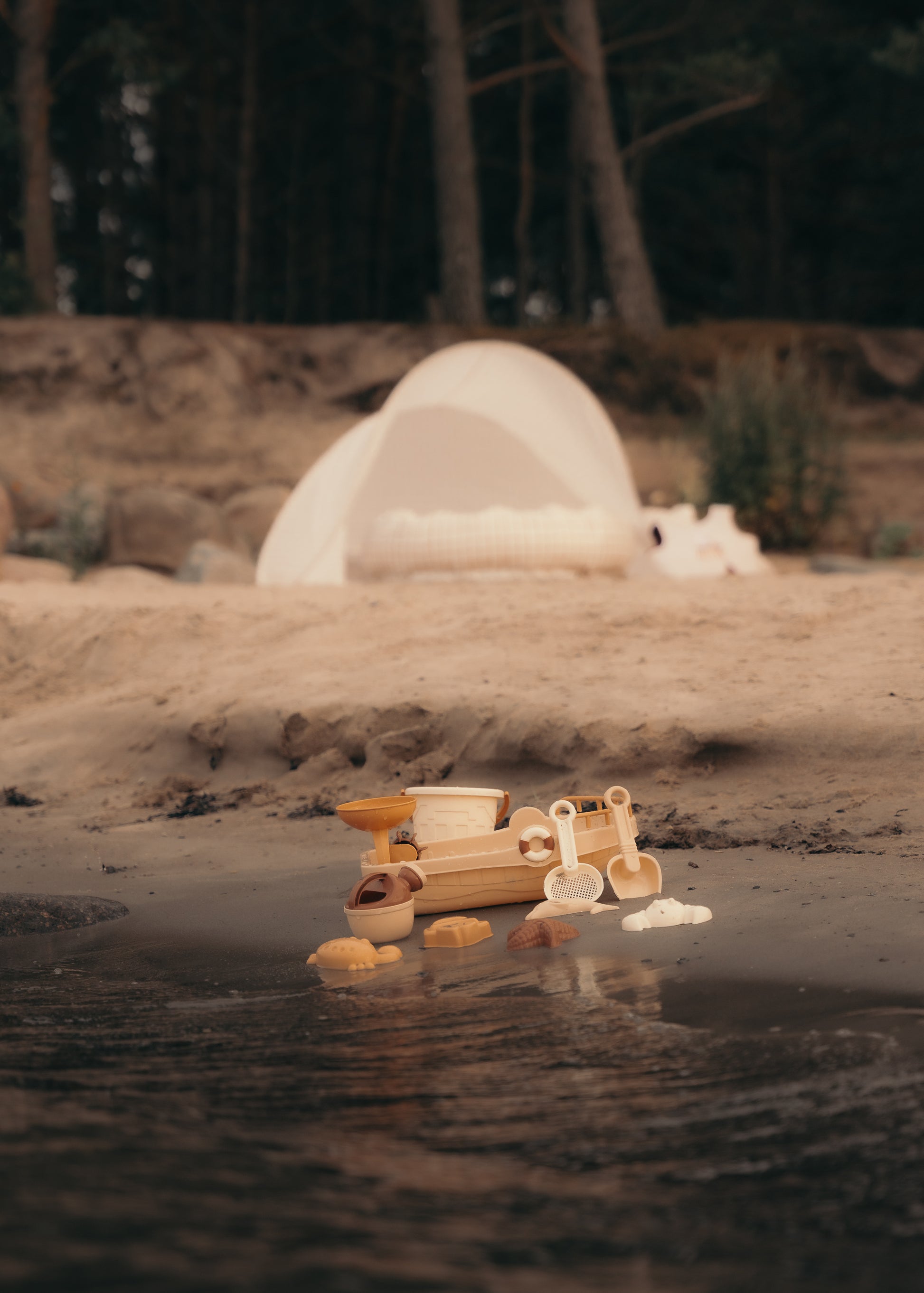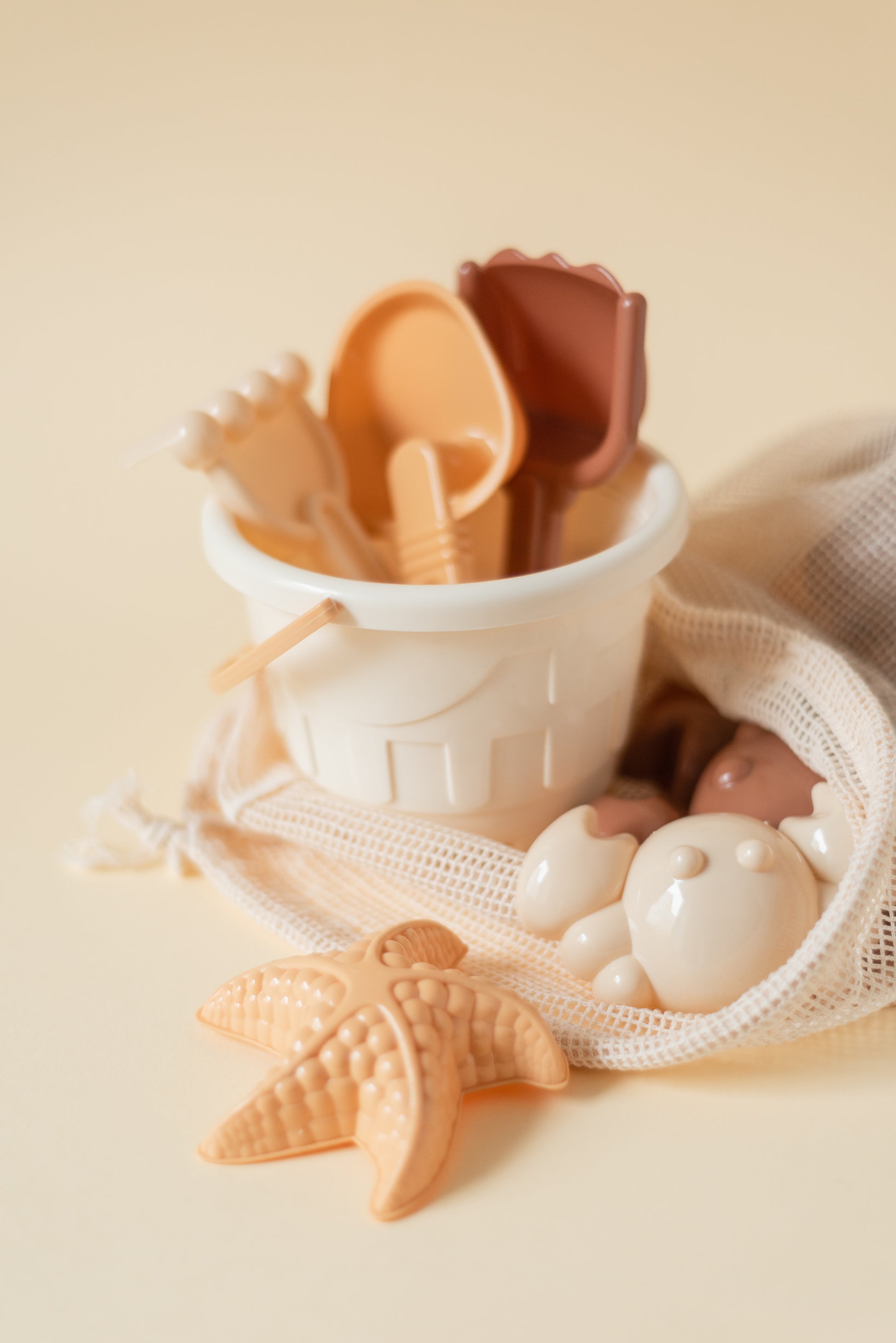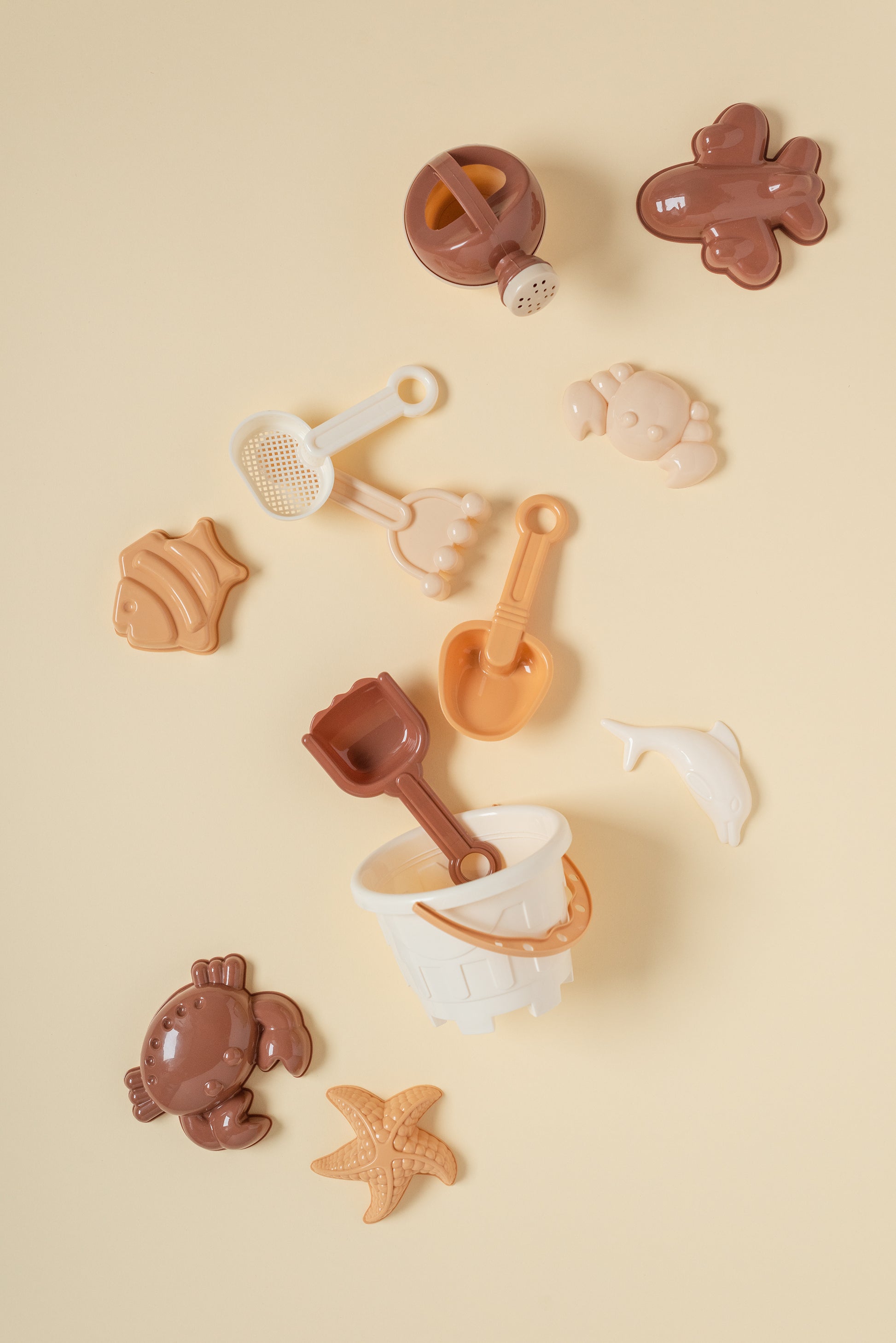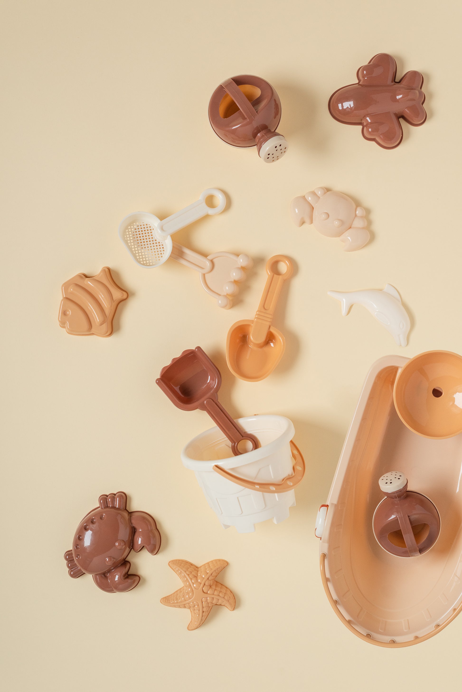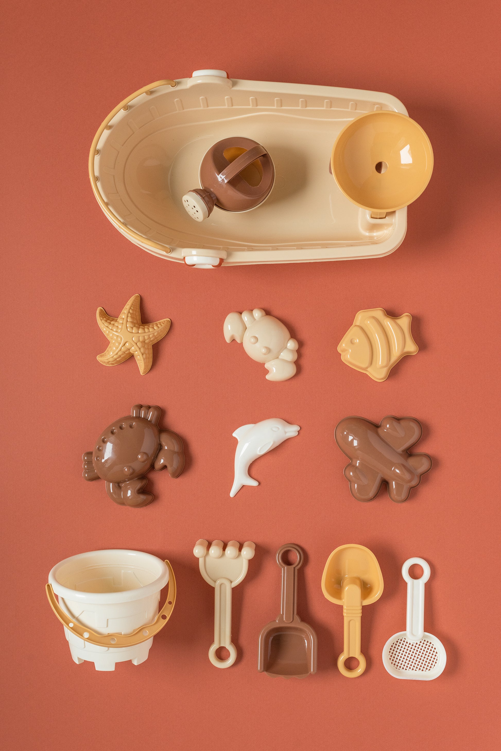 Seti ynë i lodrave të plazhit për verë që është veçanërisht për foshnjat dhe fëmijët, është bërë nga shishe të ricikluara dhe përbëhet nga 14 copa që do të jenë pjesë e aventurave imagjinare të të vegjëlve tuaj: 4 lopata, 6 kallëpe, 1 kanë uji, 1 kovë, 1 mulliri uji dhe 1 varkë.