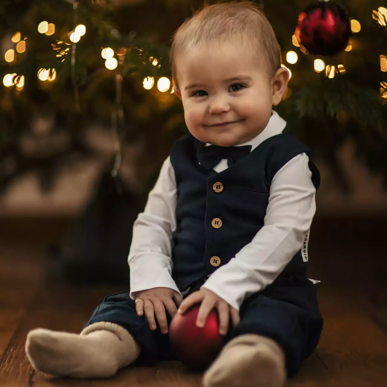 Për të gjithë vogëlushët gati për festë! Body i bardhë me jakë elegante dhe papion blu marinë, i zbukuruar me kopsa dekorative në pjesën e përparme. Një zgjedhje e ëmbël dhe festive për çdo rast të veçantë.