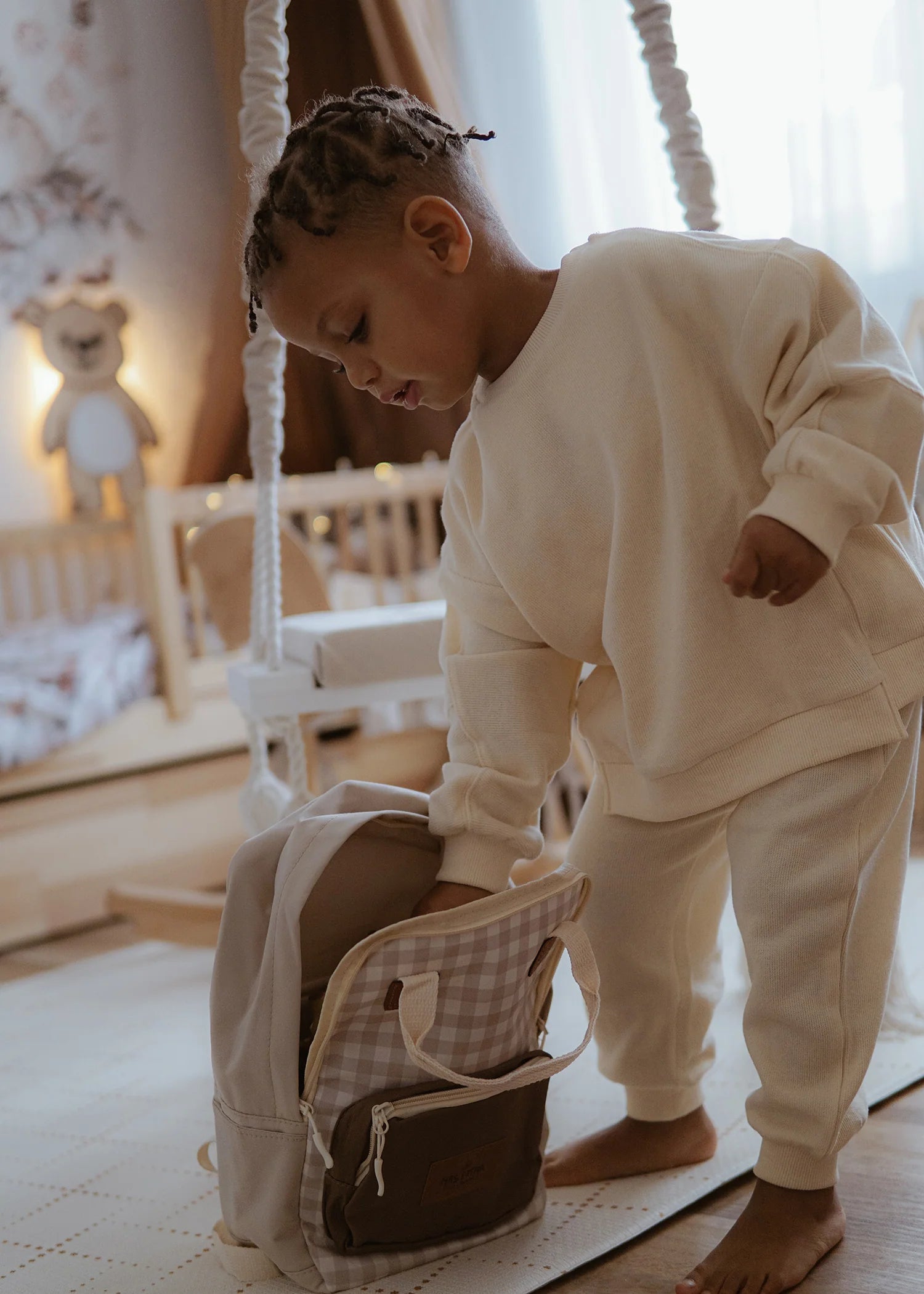 Materiali është i lehtë dhe i papërshkueshëm nga uji. Hapësira kryesore ka një hapje të madhe me zinxhir për përdorim të lehtë. Gjithashtu ka dy xhepa anësorë, një xhep në pjesën e përparme dhe një xhep me zinxhir në pjesën e pasme. Ka edhe rripa dhe pjesë të pasme të mbushura që parandalojnë që përmbajtja e çantës t'u dëmtojë shpinën fëmijëve tuaj.