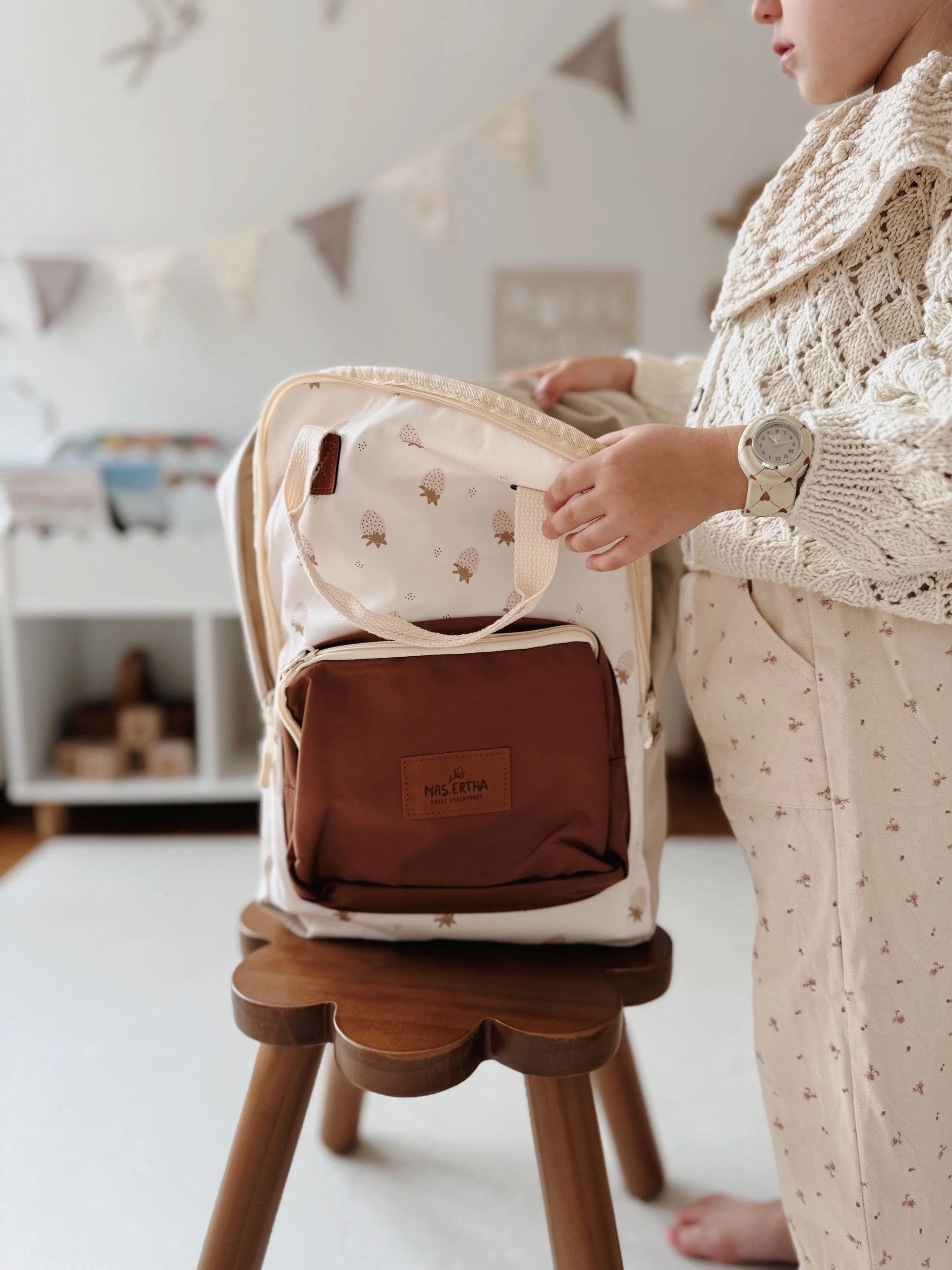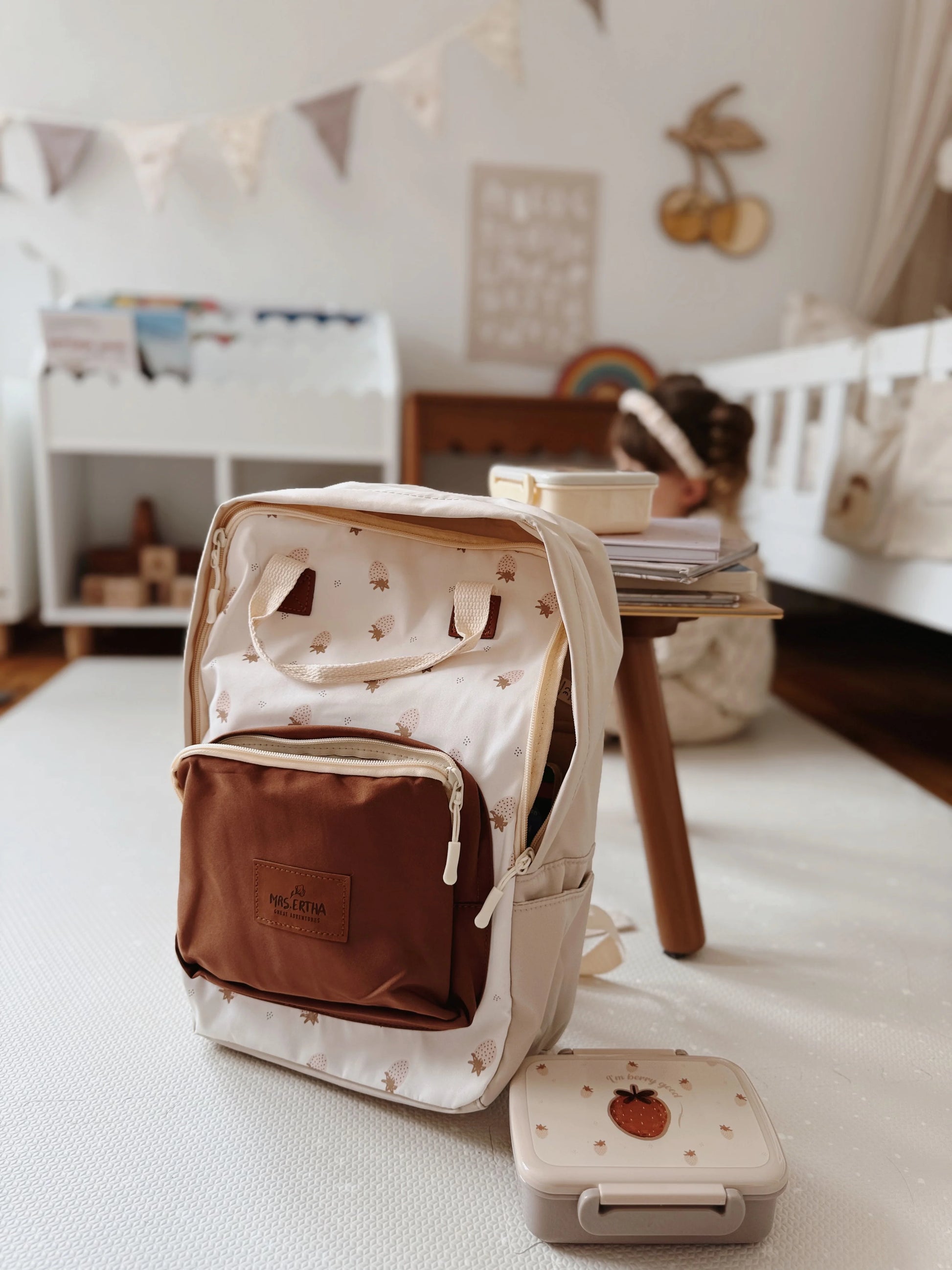 Materiali është i lehtë dhe i papërshkueshëm nga uji. Hapësira kryesore ka një hapje të madhe me zinxhir për përdorim të lehtë. Gjithashtu ka dy xhepa anësorë, një xhep në pjesën e përparme dhe një xhep me zinxhir në pjesën e pasme. Ka edhe rripa dhe pjesë të pasme të mbushura që parandalojnë që përmbajtja e çantës t'u dëmtojë shpinën fëmijëve tuaj.