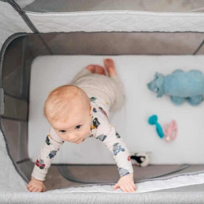 Kur fëmija rritet dhe fillon të ulet ose të ngrihet, Espiro Cloud shndërrohet lehtësisht në kosh loje. Mjafton të ulni nivelin e dyshekut dhe krijohet një hapësirë e sigurt, e rrethuar nga mure me rrjetë transparente.