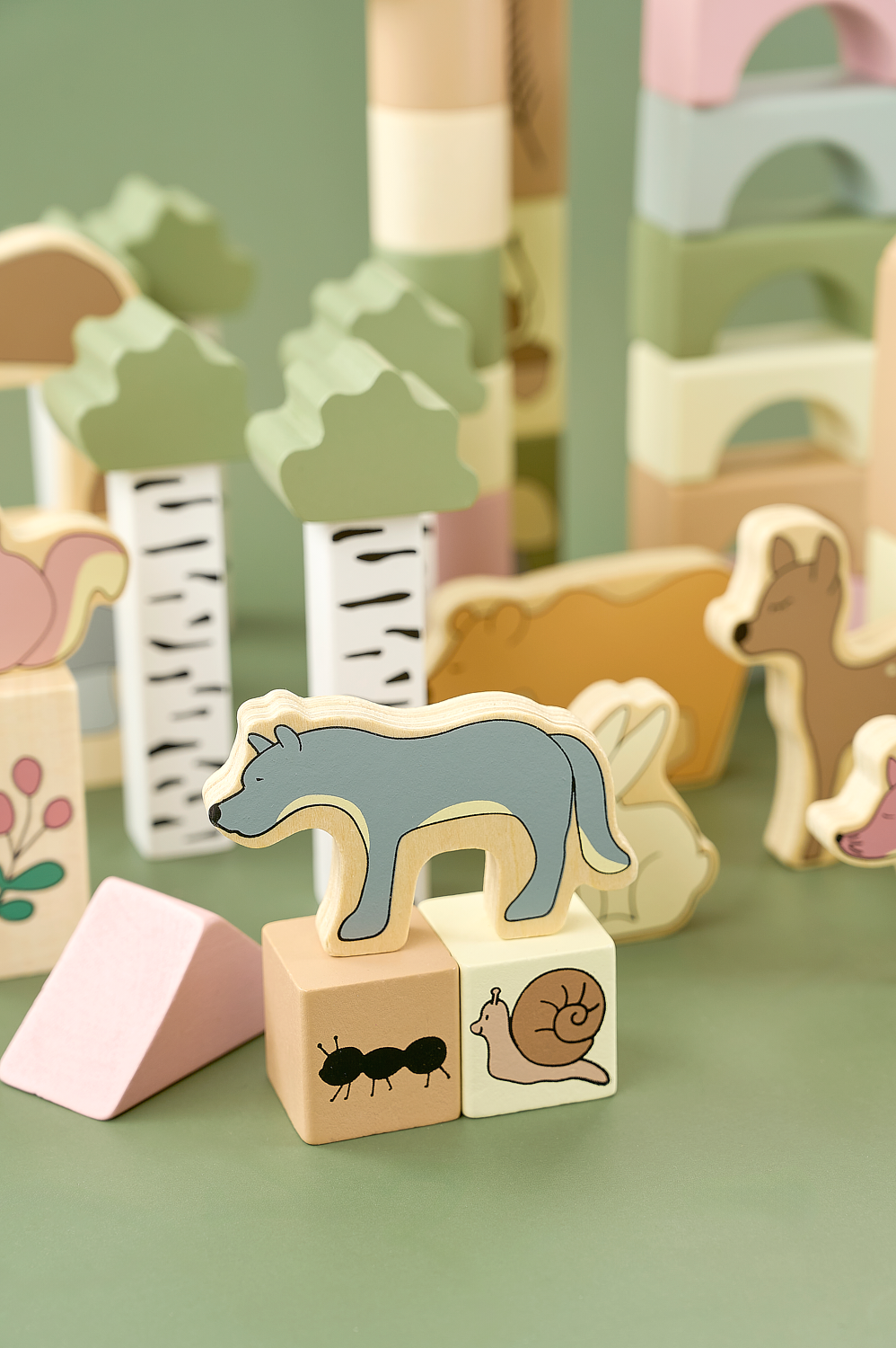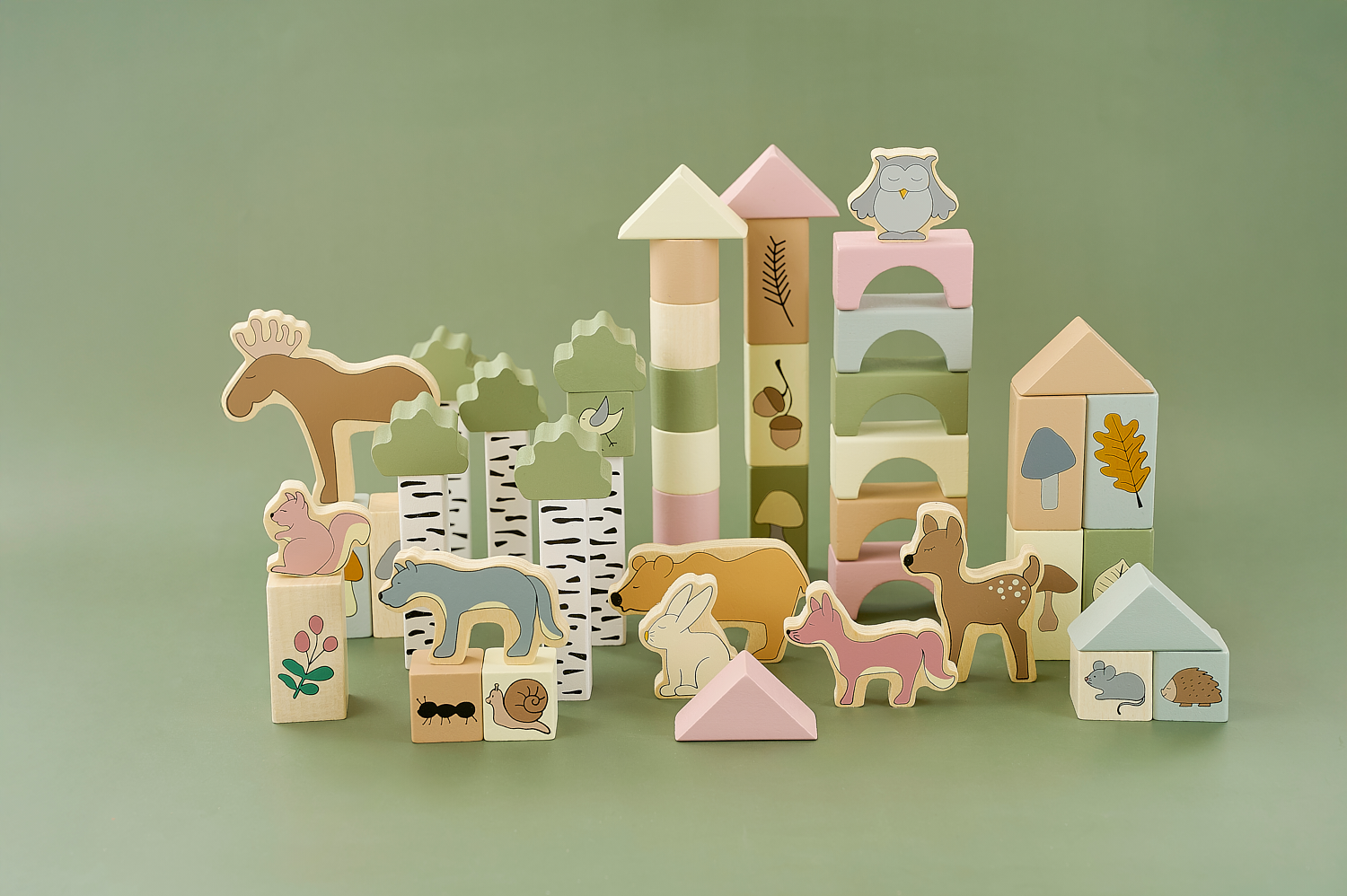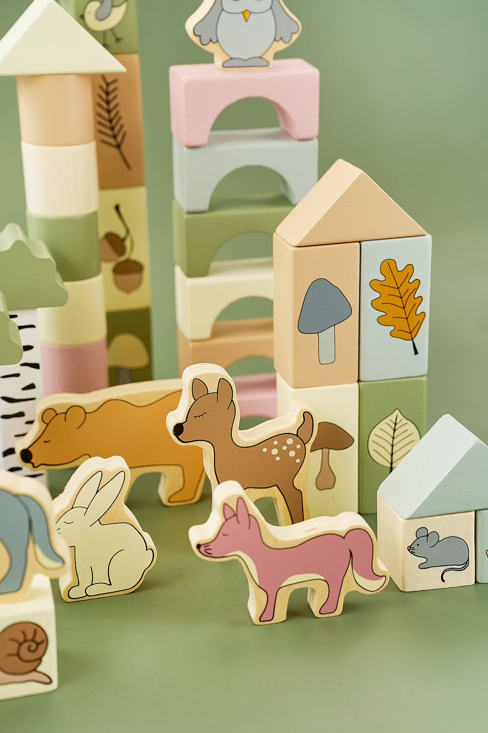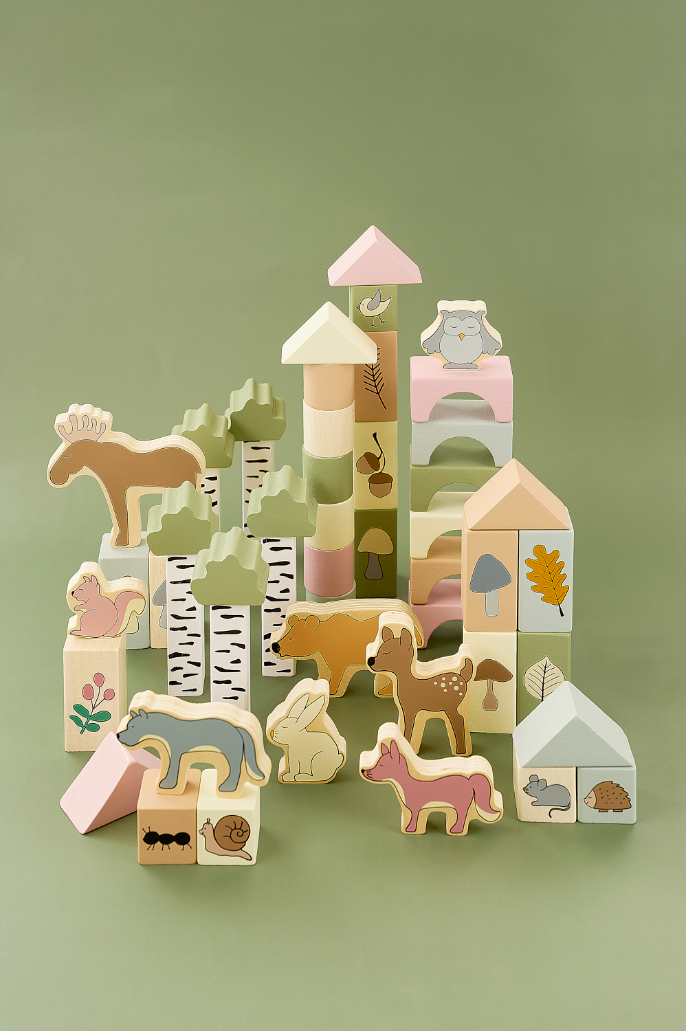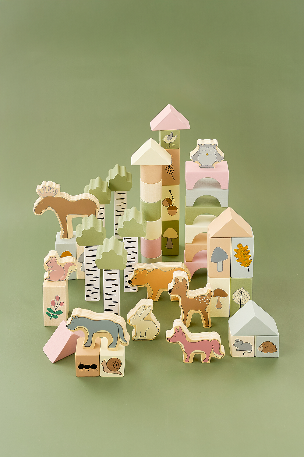 Set ndërtimi me 50 kube prej druri në ngjyra dhe forma të ndryshme, të shoqëruara edhe me figura kafshësh. Ndërtoni kulla të larta, shtëpi ose çdo krijim që imagjinata mund të shpikë! Me këtë set, fëmijët do të jenë të angazhuar për orë të tëra.Kubat ndihmojnë në zhvillimin e koordinimit, durimit dhe aftësisë për të dalluar ngjyrat dhe format, duke zbuluar njëkohësisht aftësitë e tyre krijuese. Mundësitë e ndërtimit janë të pafundme.Fëmijët mund të luajnë të pavarur ose të ndërtoni së bashku.