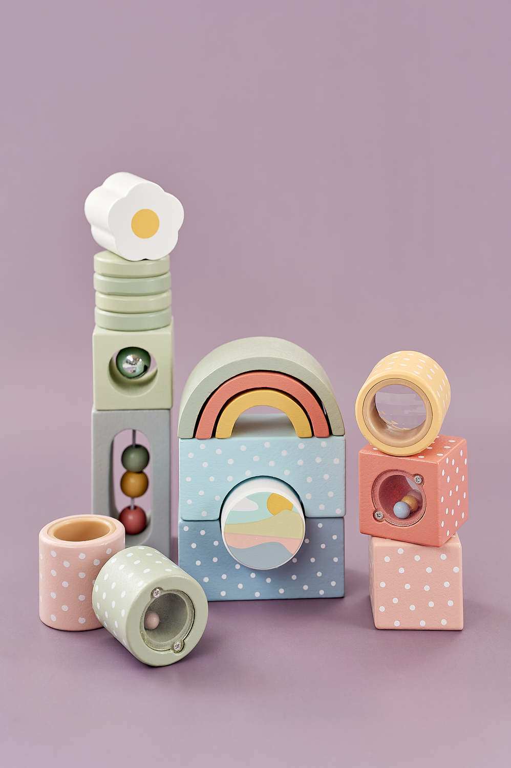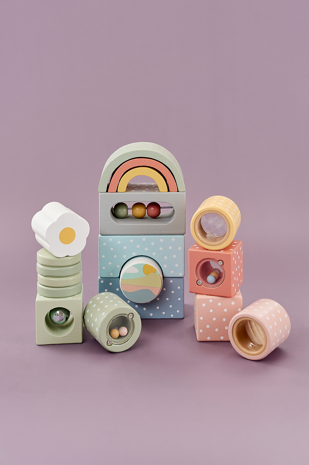 Çdo bllok është unik – disa bëjnë zhurmë kur tunden, të tjerë tingëllojnë lehtë, ndërsa disa kanë ngjyra të buta dhe modele tërheqëse që i pëlqejnë çdo aventurieri të vogël.