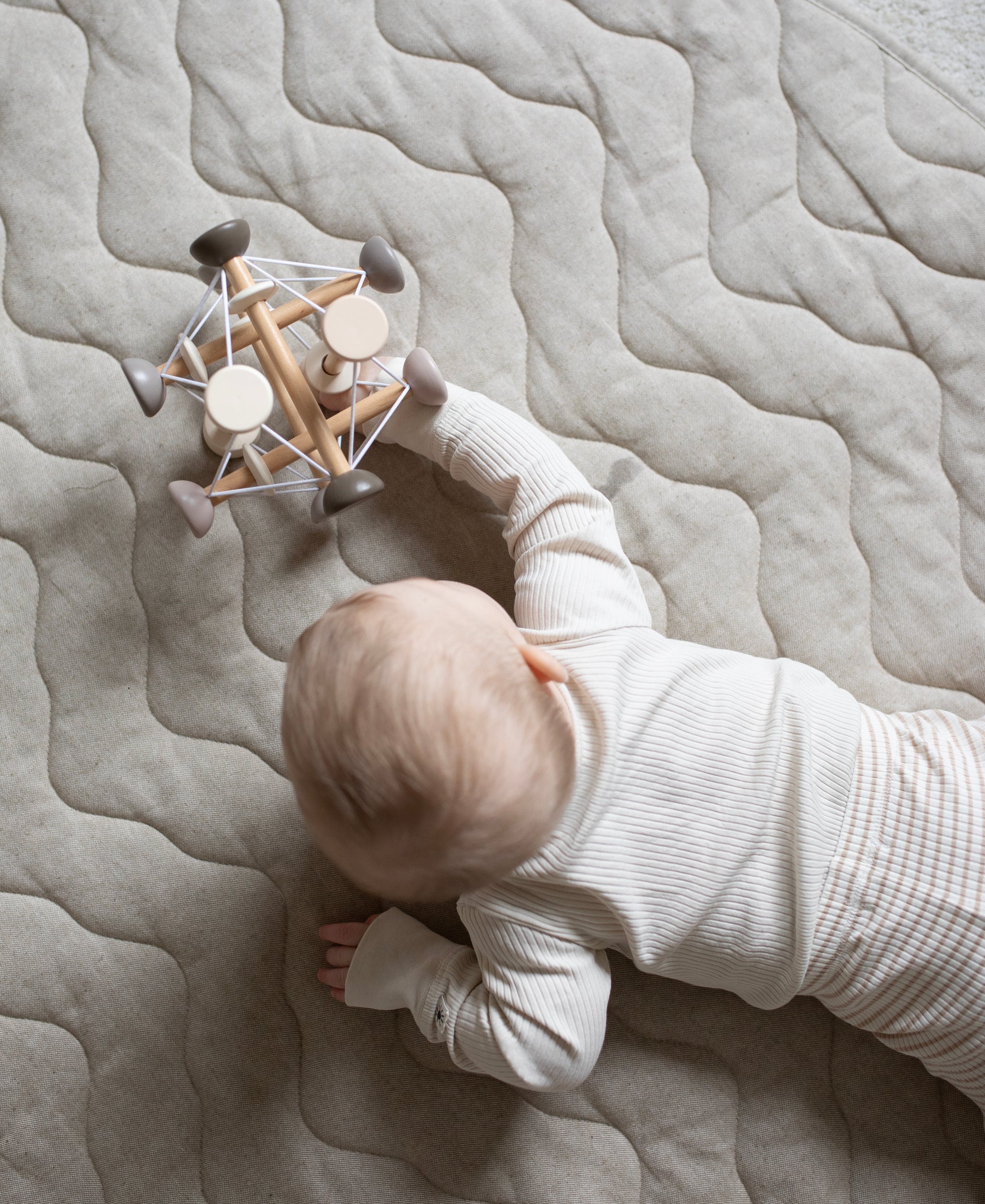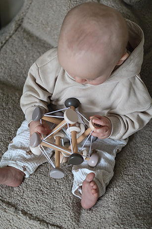 Një lodër aktiviteti për fëmijët e vegjël që stimulon shumë shqisa njëkohësisht. Shiritat e butë prej gome janë të pajisur me unaza druri që mund të rrotullohen dhe të tërhiqen. Ato mbajnë së bashku shkopinjtë prej druri, të cilët mund të shtypen drejt njëri-tjetrit ose të tërhiqen jashtë, duke krijuar lëvizje dhe forma të ndryshme.